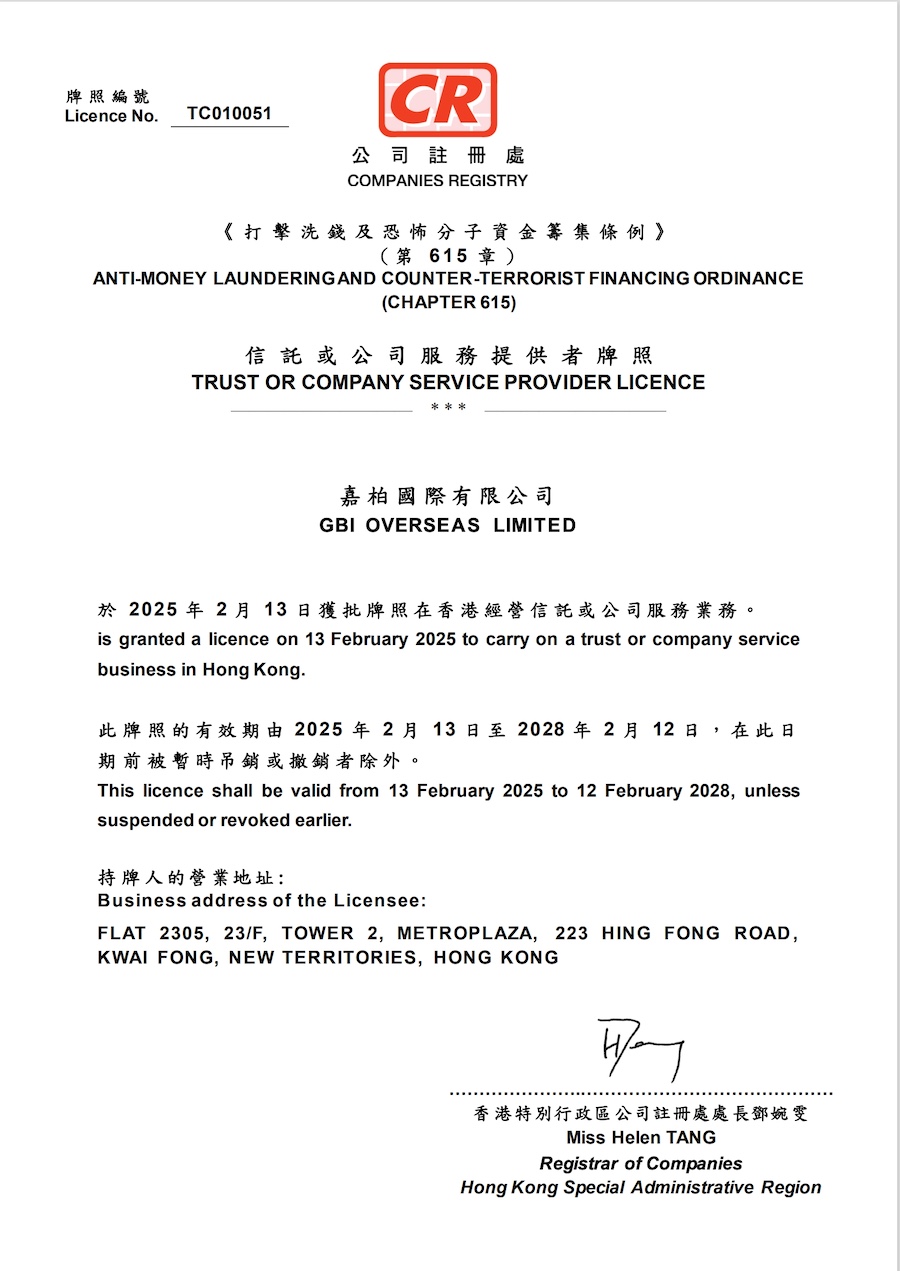 我們以風險為本的策略,以“客戶控制權”為原則的服務交付標準,全流程服務無外包。 獲發全部由政府規管業務的牌照或許可,完全自主開發Complus港企+ 自助服務平台,完善的隱私保護及反洗錢政策, 港企Plus® 客戶自助平台信托及公司服務牌照金錢服務經營者牌照保險經紀人牌照港企Plus® 客戶自助平台 港企Plus®客戶自助管理平台 公司注冊處對所有運營成立公司、管理、秘書、信托等類型服務的服務提供者進行規管,以監管反洗錢及可疑交易報告的主體責任。 公司作爲信托與公司服務持牌人,以制定並更新各項切實可行的政策制度保障企業服務的順利實施。 信托及公司服務牌照 信托與公司服務持牌人 編號:TC00051 公司注冊處對所有運營成立公司、管理、秘書、信托等類型服務的服務提供者進行規管,以監管反洗錢及可疑交易報告的主體責任。 公司作爲信托與公司服務持牌人,以制定並更新各項切實可行的政策制度保障企業服務的順利實施。 金錢服務經營者牌照保險經紀人牌照